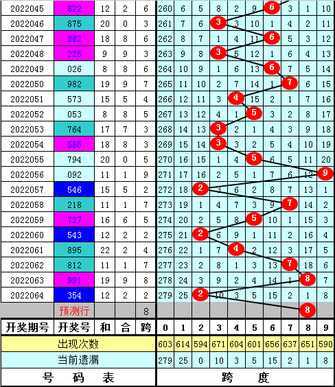福彩3D第2022064期最大跨度开出2,近期最大跨度波动较大,本期预计最大跨度在5-9区段开出,最大跨度参考6789,一码跨度参考8。