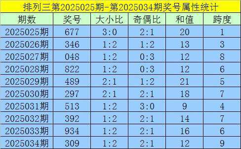上期回顾:排列三第2025034期出现奖号309。开出组六,奇偶比2:1,012路比3:0:0,大小比1:2,和值12,跨度9。
