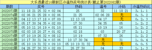 孟浩然体彩大乐透第2022083期奖号冷温热码统计(冷码:遗漏9期以上的号码,温码:遗漏4-9期的号码,热码:遗漏0-3期的号码)