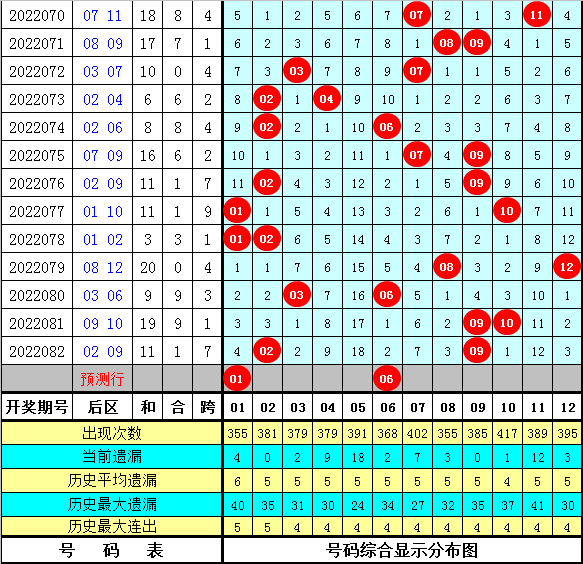 后区分析:上期后区奖号为02和09,最近十期后区开出11个热码、6个温码和3个冷码,本期预计奖号关注温码+热码组合,参考两码01、06。