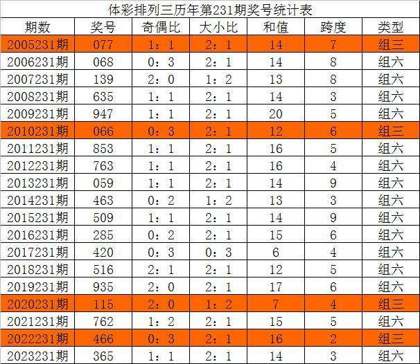 体彩排列三历年第231期开出奖号分别为:077、068、139、635、947、066、853、763、059、463、509、285、420、516、935、115、762、466、365。统计详见下表: