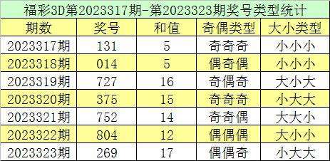 福彩3D第2023323期回顾:奖号为269,奖号奇偶比为1:2,大小比为2:1,和值为17,类型为组六。