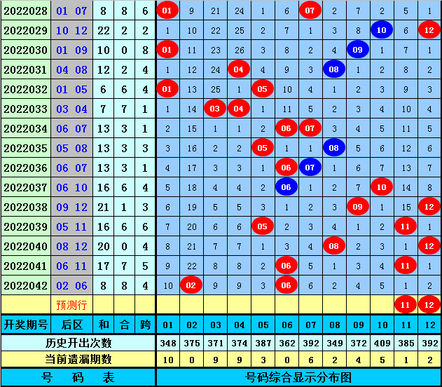 前区重号分析:上期前区奖号没有开出重号,重号在前7期开奖中出现3期,开出比例为43%,共出现4个重号,本期预计重号继续走冷,放弃重号。