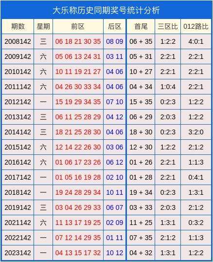 后区分析:去年同期后区号码为10、12,在历史同期数据中出现过1次10、12,出现得概率为6。67%,本期预测后区开出10,11的可能性较大。