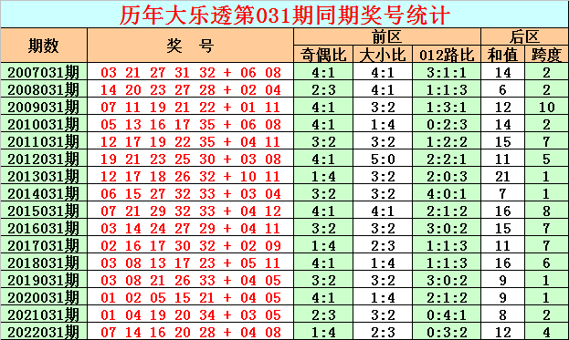 在历史同期开奖中,后区号码和值奇偶为8:8,基本相等,本期适当关注偶号和值开出,参考和值12。