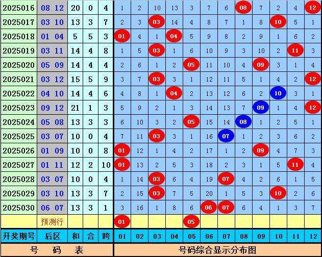 后区分析(一区01-04,二区05-08,三区09-12):上期后区开出奖号06和07,最近10期后区三区落号比为7:13:7,本期后区关注号码01、04、05、10、12,后区两码参考01、05。