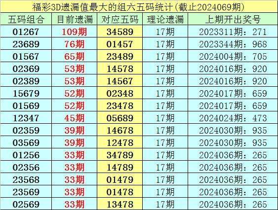 福彩3D五码遗漏组六分析(第2002001期-第2024069期)