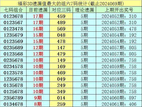 1。截止第24069期,七码组六遗漏最大的是:0123678、0123567,当前遗漏17期。