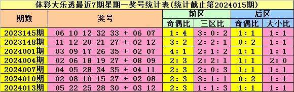 上期回顾:体彩大乐透第2024015期开出奖号08 11 14 24 31 + 05 06,其中前区奖号奇偶比为2:3,三区比为2:2:1,后区奖号奇偶比为1:1,大小比为0:2。