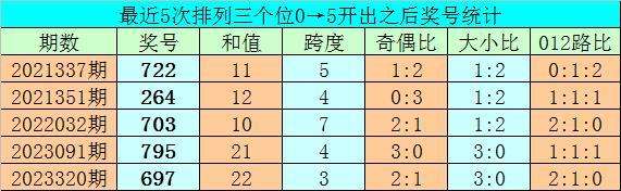 1、排列三前两期个位分别开出号码0和5,历史上个位号码连续两期分别出现0和5时,共有52次。在最近5次出现时,其下期分别出现号码:722、264、703、795、697;