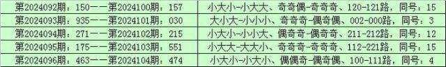 统计排列三已开出的奖号发现,在连续5期(第2024092期-第2024096)奖号为:150-935-271-175-463。