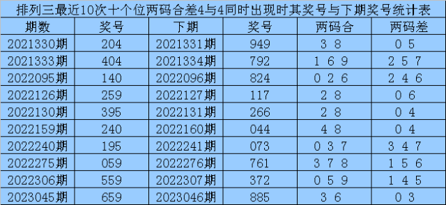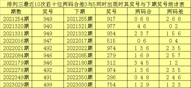 百十位合差分析:上期奖号百十位开出94组合,两码合为3,两码差为5,最近10次百十位两码合3与两码差5同时出现时,其奖号和下期奖号分别为: