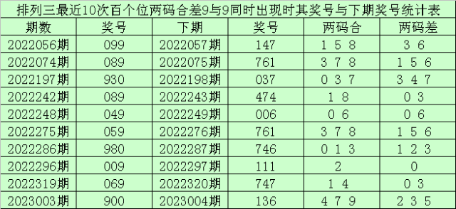 百个位合差分析:上期奖号百个位开出90组合,两码合为9,两码差为9,最近10次百个位两码合9与两码差9同时出现时,其奖号和下期奖号分别为:
