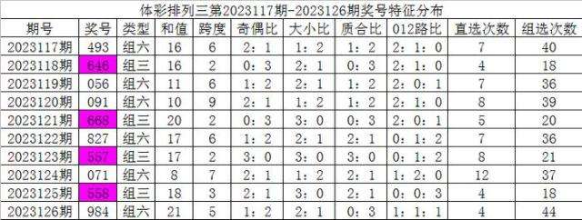 开奖公告:体彩排列三第2023126期开出奖号:984。组六,有重号:8,奇偶比1:2,大小比2:1,012比1:1:1,和值21,跨度5。