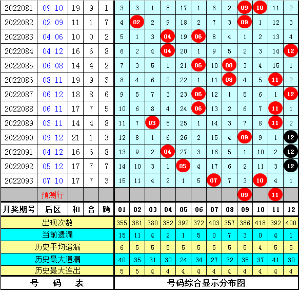 后区号码分析:在前7周星期三开奖中,后区奇偶号码个数比为3:11,偶数号码出现较热,后区大小号码个数比为7:7,大小号码开出个数基本持平,本期后区防全大组合,关注号码07、09、11、12,精选两码09、11。