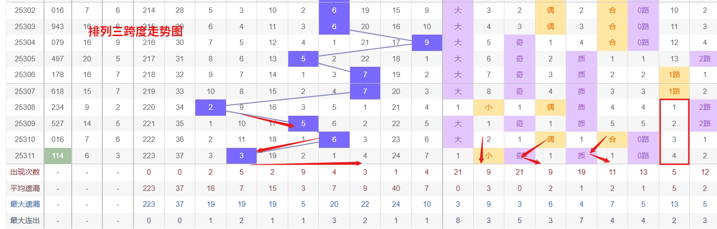 排列三 跨度分析:从上图可以看出近100期的跨度大小比约为47比53,跨度奇偶比约为48比52总体来看还是比较均衡的,但跨度大小之间有点差异。我们再从历史开出3跨后下一期5跨度数据来做参考。最近10期跨度大小比约为6:4期开出大数跨度过多返回小数跨度的概率更高一点。历史开奖近2期出3跨以后的走势为237期开出3跨后下一期走5跨走出2振幅,第246期开出3跨后下一期走8跨走出5振幅第257期开出3跨后下一期开出4跨走出1个振幅。连续多期大振幅,排列三近期的跨度走势分析,跨度5作为热号表现强势,其活跃态势有望延续,存在连续开出的可能性,应作为近期关注重点;与此同时,跨度8已进入冷态阶段,长期遗漏后回补概率正在累积,须警惕其突然解冻。采取"追热防冷"策略,在重点关注跨度5连下可能的同时,适当防守跨度8的冷号回补,综合以上分析后得出,本期预计跨度遵从历史会走出大振幅,出3跨度后容易走出1到5个跨度振幅的对称形态,跨度走出1到5个振幅看好的跨度有2458跨,所以第2025312期排列三跨度推荐2458跨。本文由彩虹多多钱是生命动力所著,请勿转载