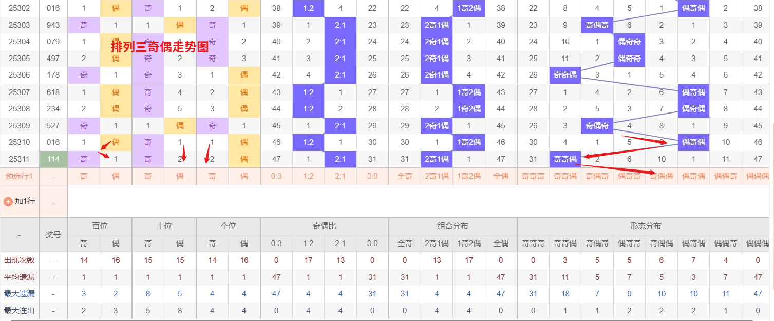 排列三 奇偶分析:从上图可以看出排列三100期内百位奇偶比约为53比47,十位奇偶比为48比52,个位奇偶比为46比54,十位的比值比较均衡,但是百位的比值偏差就有点大,历史奇偶形态近2期开出奇奇偶后下一期的走势为,第234期开出奇奇偶后235期开偶奇奇, 第243期开出奇奇偶后第244期开奇偶偶,第254期开出奇奇偶后第255期开偶偶偶,排列三近期的奇偶走势分析,“偶奇奇”与“奇偶偶”组合持续活跃,已成为当前盘面的热态模式。从走势规律来看,热号形态往往具备持续动能,短期内存在连续开出的可能性,值得作为重点跟踪对象。与此同时,“偶偶偶”全偶组合已长期遗漏,进入冷态区间。根据冷热转换的对称规律,此类极端组合随着遗漏期数延长,其回补概率正不断累积,须警惕其突然解冻。采取“追热防冷”的均衡策略,在重点关注“偶奇奇”“奇偶偶”热态延续的同时,需对“偶偶偶”组合的冷号回补保持防范,所以排列三2025312期奇偶形态推偶奇奇与偶偶偶。本文由彩虹多多钱是生命动力所著,请勿转载