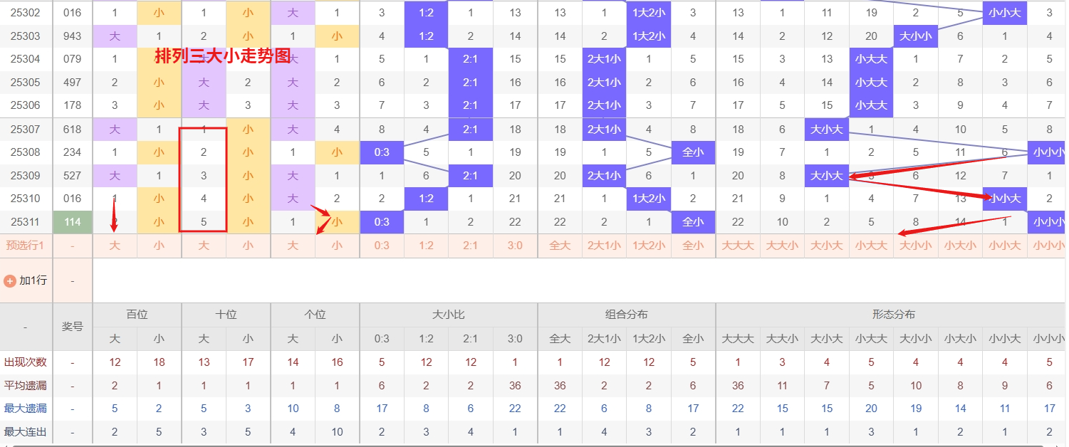 排列三 大小形态分析:从大小走势图上可以看出排列三100期内百位大小比约为52比48,十位大小比约为45:55,个位大小比约为53比47,除了个位和百位奇数比偶数多,十位是偶数比奇数多。历史数据近2期开出小小小下一期的走势为,第235期开出小小小第236期开大大大。第247期开出小小小后第248期开大小小,第254期开出小小小后255期开小小大。排列三近期的大小走势分析,“大小小”组合持续活跃,形成明显热态,短期内仍有延续趋势的可能,值得作为重点关注对象;而“大大大”全大组合已长期未见,持续遗漏使其进入冷态区间,根据冷热平衡的规律,此类极端组合的回补压力正不断累积,须警惕其突然解冻开出。采取“追热防冷”的均衡策略,在关注“大小小”热态延续的同时,对“大大大”组合的冷号回补保持防范,所以排列三第2025312期大小形态推荐大小小防大大大。本文由彩虹多多钱是生命动力所著,请勿转载
