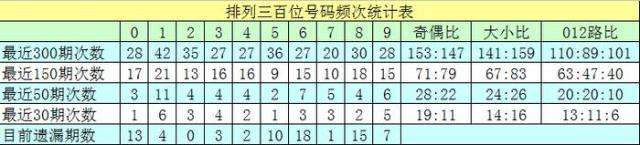百位号码:前50期走势活跃的号码为:1开出11个,6开出7个,9开出6个;走势最冷的号码为:5开出2个,0开出3个,2、3、4、8开出4个。奖号012路比开出20:20:10,奇偶比开出28:22。本期百位杀排除:2、8,注意号码1、4、5,胆码参考1。