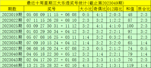 其中,号码质合比为3:7,奇偶比为6:4,奇数号码走势较热,012路比为3:2:5,2路号码相对较热;