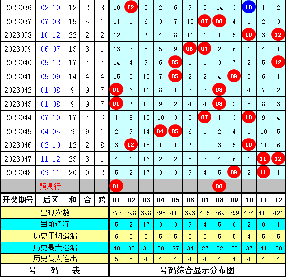 后区分析:最近10周星期三一大一小开出7次,全大开出3次,全小开出0次;全奇开出1次,全偶开出5次,一奇一偶开出4次,本期后区注意两码01+08。