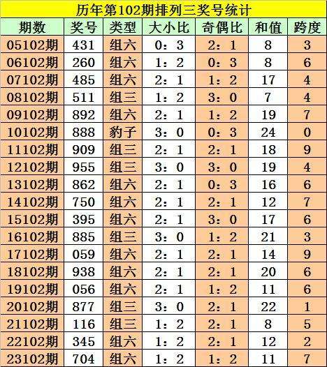 历年第102期奖号:大小比为35:22,小号较少,本期小号回补,大小比参考1:2。