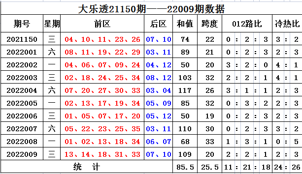 012路号码:上期开出前区012路比为2:2:1,近十期0路号码开出11次,1路开出21次,2路开出18次,0路号码较冷,本期重点关注2路出号优势,关注012路比0:2:3。