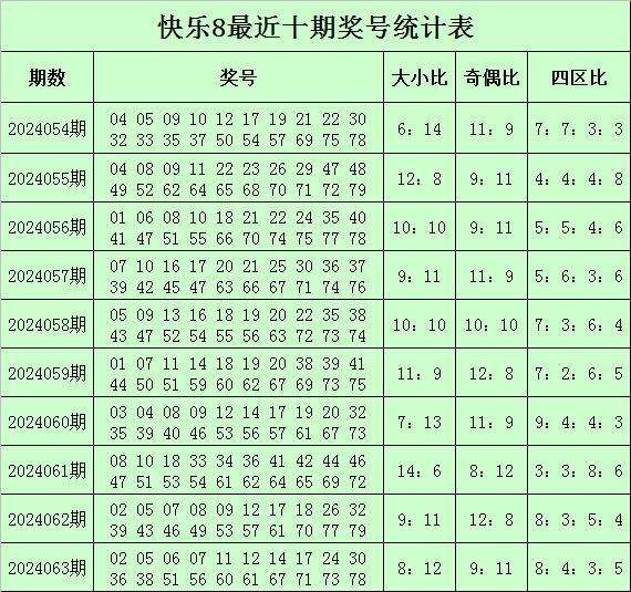 福彩快乐8第2024063期开奖回顾:02 05 06 07 11 12 14 17 24 30 36 38 51 56 60 61 67 71 73 78,其中奖号四区比为8:4:3:5,奇偶比为9:11,大小比为8:12。