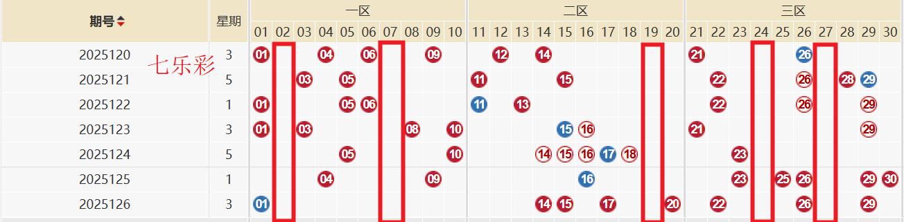 近七期开奖中一区出号数量为4+2+3+4+2+2+0=17枚,整体占比为34.7%;二区出号数量为2+2+1+1+4+0+4=14枚,整体占比为28.6%;三区出号数量为1+3+3+2+1+5+3=18枚,整体占比为36.7%。一区整体占比略高于均值,周期内呈现下降趋势,周期内断区一次,波动较大,本期断区可能性不大。二区占比低于均值,呈现上升趋势,周期内断区一次,波动较大,本期慎防。三区占比略高于均值,呈现下降趋势,鉴于整体波动,本期慎防。基于动态平衡干预以及波动趋势衡量,本期七乐彩开奖三区比倾向于1:2:4。重点关注周期遗漏的2,7,19,24,27。
