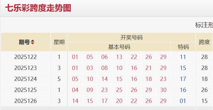 近五期七乐彩开奖号码跨度依次为28→28→18→26→15。周期跨度均值为23。周期跨度振幅为13。周期修正跨度振幅为9。基于动态平衡干预以及波动趋势衡量,本期开奖跨度推测区间为14-32。基于风险对冲策略,本期开奖跨度区间缩水为22-29。
