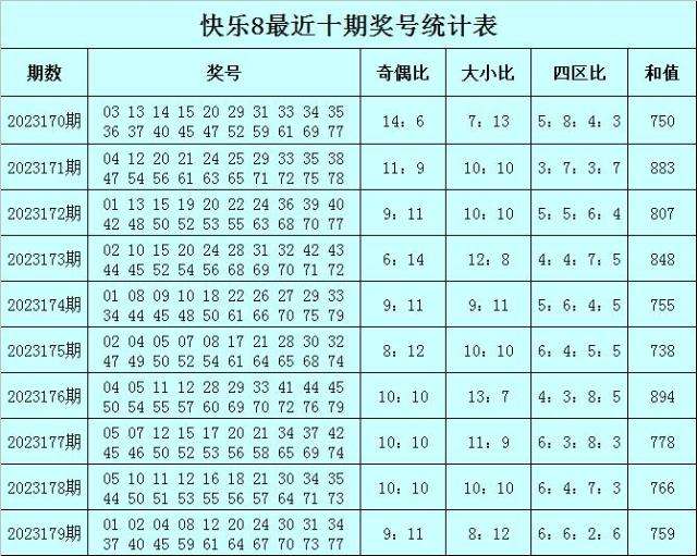 福彩快乐8第2023179期开奖回顾:01 02 04 08 12 20 24 30 31 34 37 40 45 59 61 64 67 70 73 77,其中奖号四区比为6:6:2:6,奇偶比比为9:11,大小比为8:12,和值为759。
