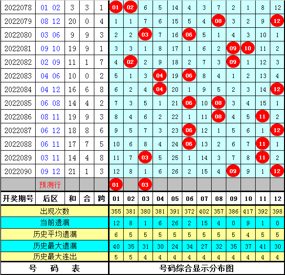 上期后区开出号码:09+12,一奇一偶组合、全0路组合、全大组合。本期后区防2路号断档,两码看好01、03。