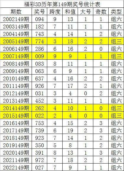 福彩3D历年第149期同期分别开出奖号:094、182、743、774、286、009、083、063、637、926、031、452、262、022、753、739、923、350、391、972、027,详细统计见下表: