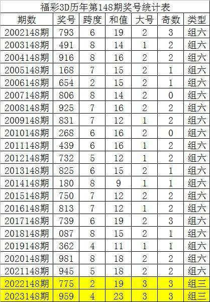 从以上统计可以看出,历年3D第149期开出了4次组三号码,开出了17次组六号码。组六号码出现概率大,本期预计开出组六号码。