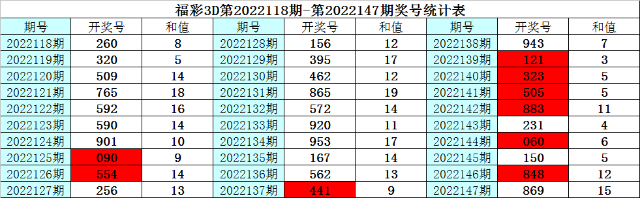上期回顾:福彩3D第2022147期奖号为:869,其中奖号组选类型为:组六,奇偶比为1:2,大小比为3:0,012路比为2:0:1,和值为23,跨度为3。
