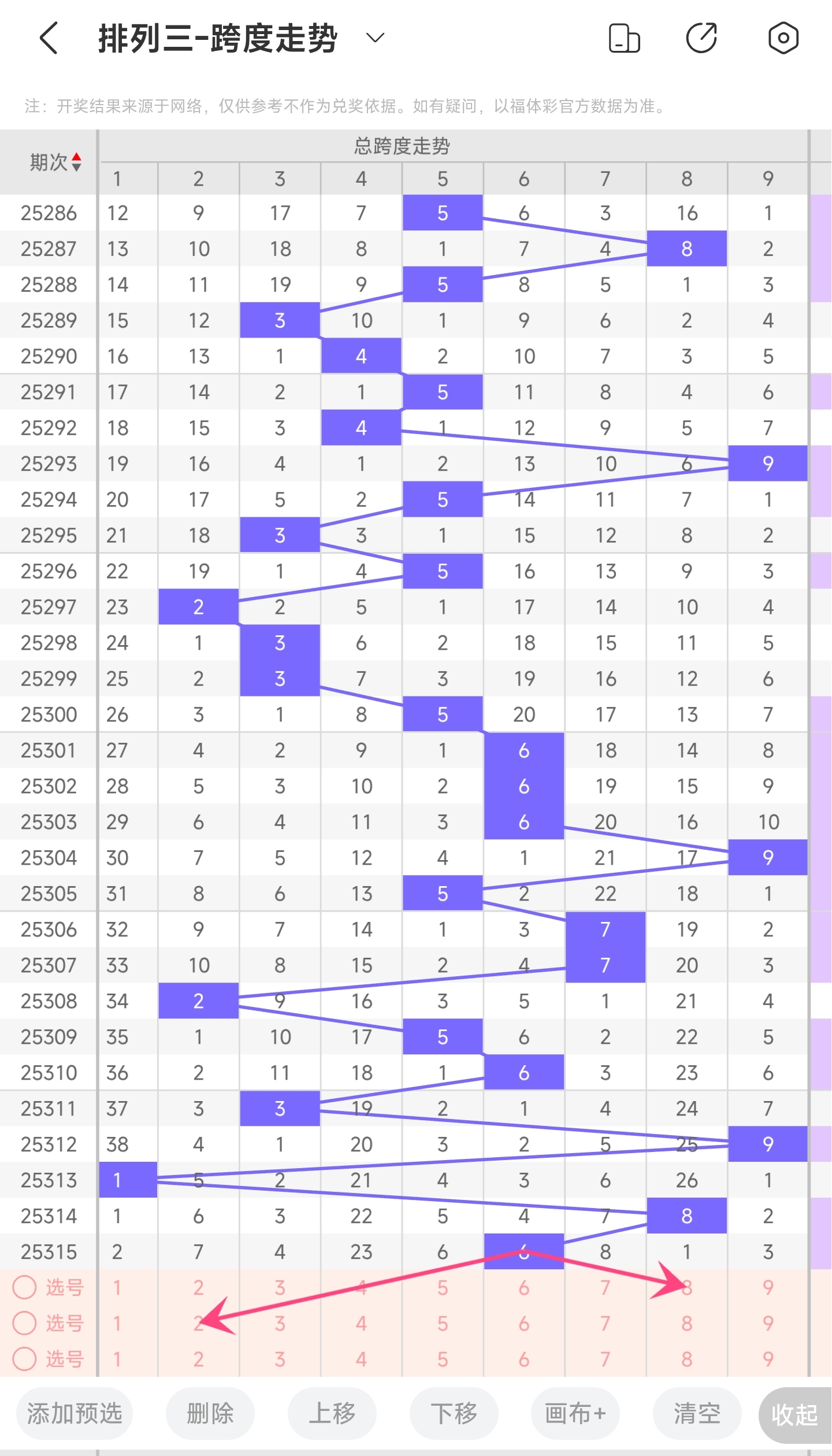 上期跨度为6,往前一期跨度是8,趋势往左移动,偏移量为2。跨度值6时,跨度值是近30期内开出的中间位置的值。通过走势图分析,目前的趋势是可能往左也可能往右。所以推测本期跨度可能为12389等跨度。