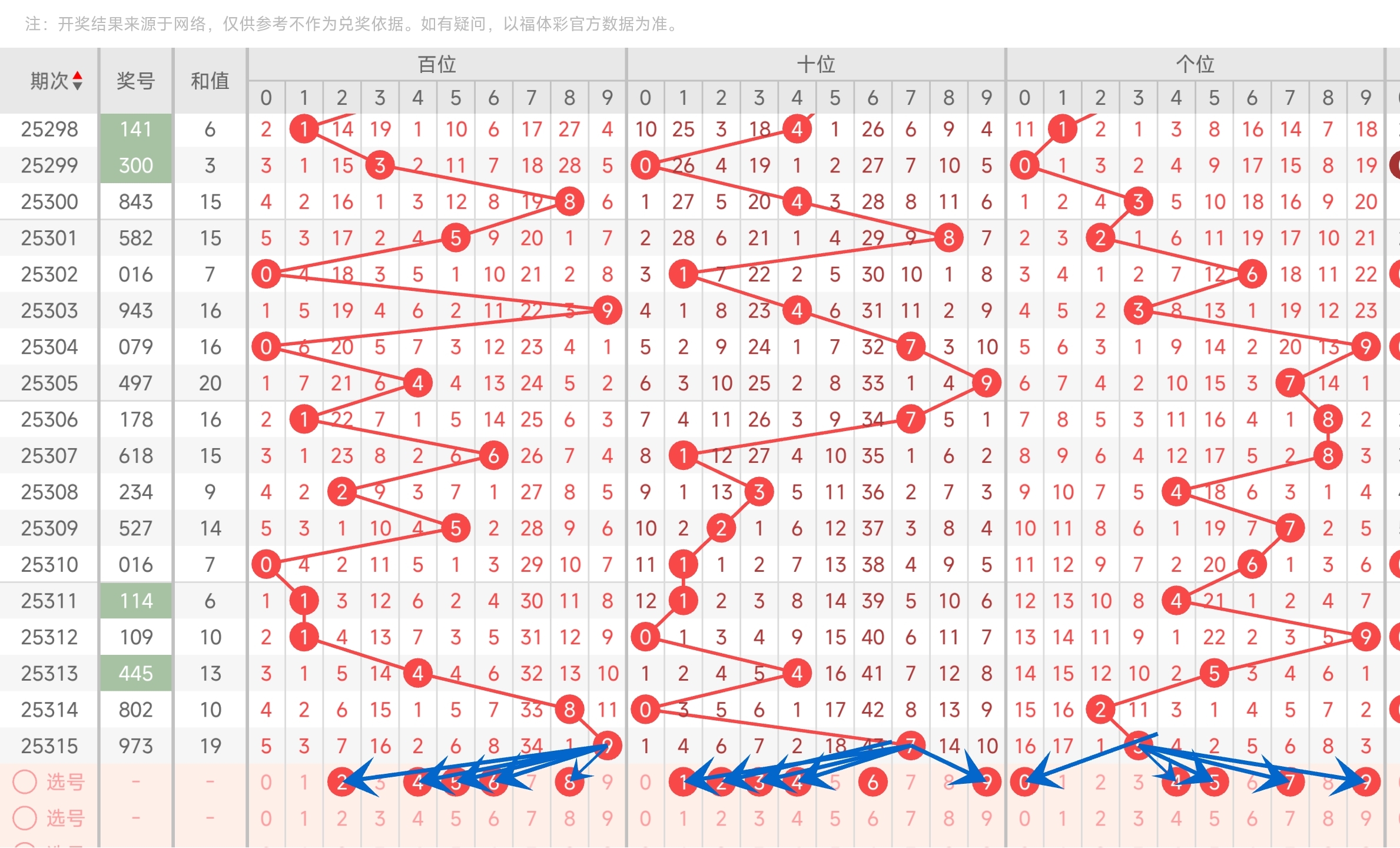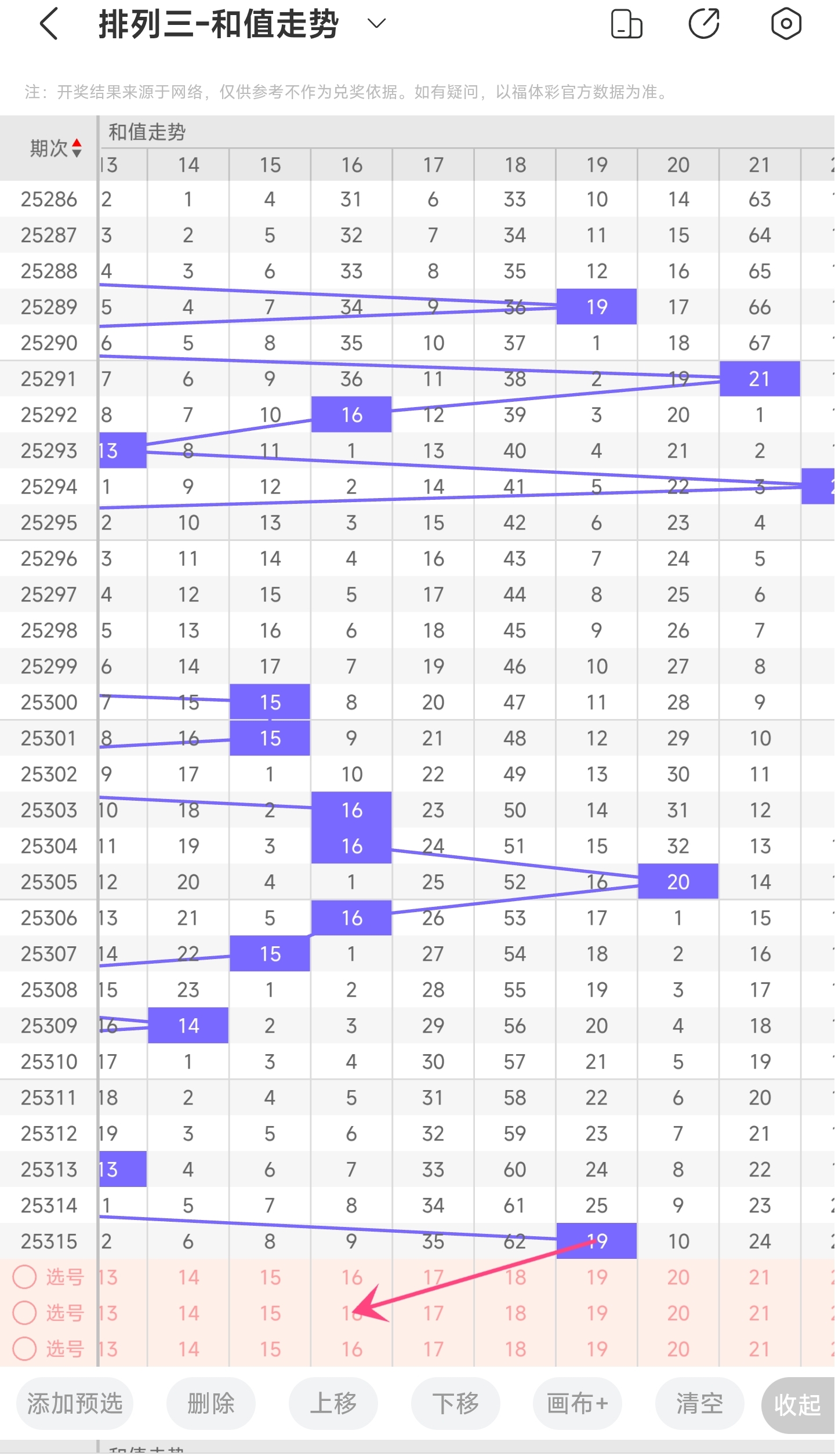 上期和值为19,往前一期和值为10,趋势往右移动,偏移量为9。通过走势图分析,19和值是近30期内开出的比较大的和值,下降空间比较大,上升空间比较小。本期看好小和值,因此推测本期趋势是往左右的,和值会变小,小概率往右,和值变大。