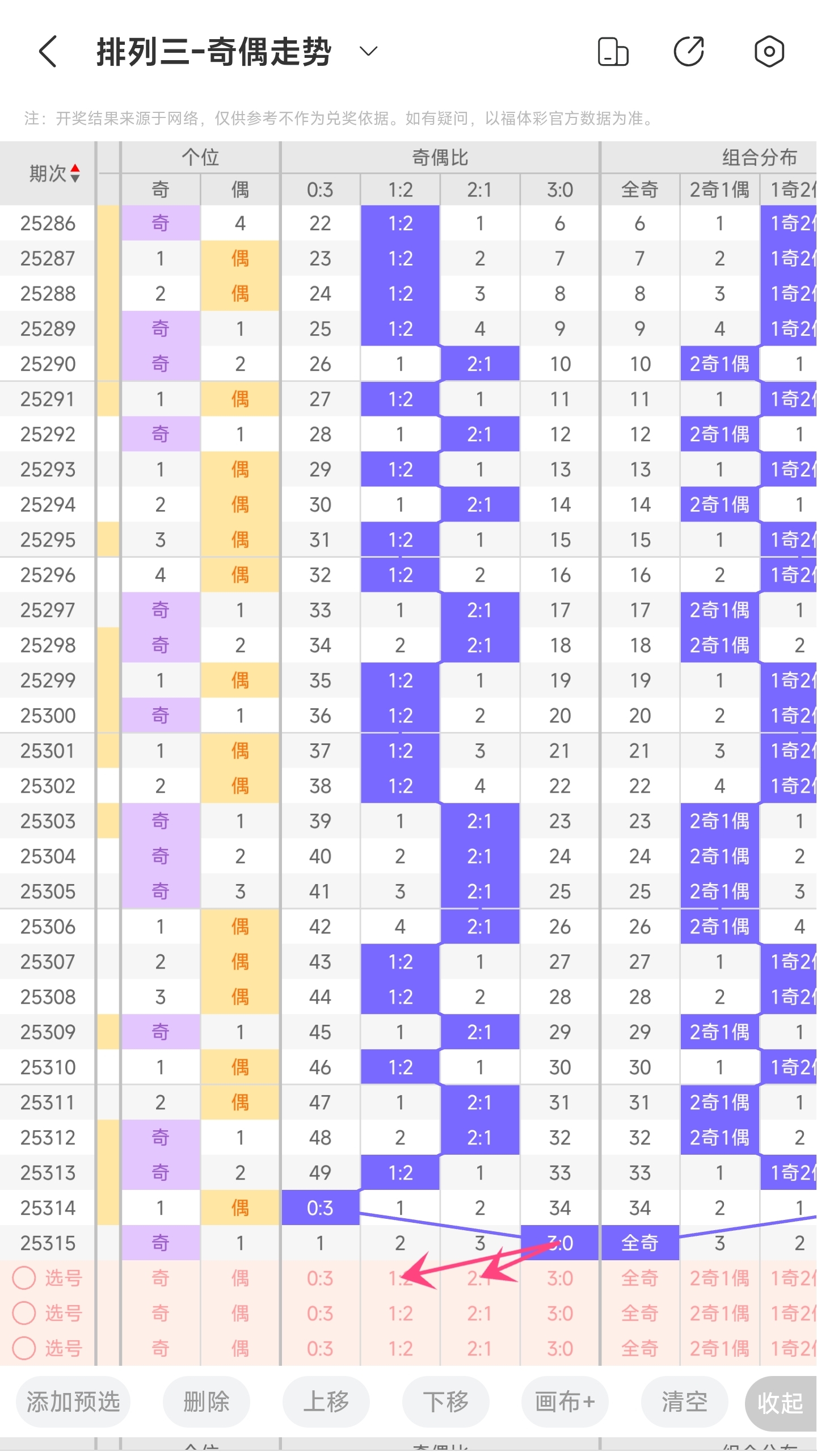 上期开出了3:0的奇偶比。往前一期是0:3奇偶比。通过分析奇偶走势图,近30期内开出1:2奇偶比的次数是16次,开出2:1奇偶比的次数是12次,3:0是1次,0:3是1次。和前一期相比,3:0次数变多,2:1次数变少。通过走势图分析,可以就看到3:0奇偶比是很少开出的,所以本期看好其它类型开出。所以推测本期可能开2:1奇偶比或者1:2奇偶比,最后是3:0或者0:3奇偶比。