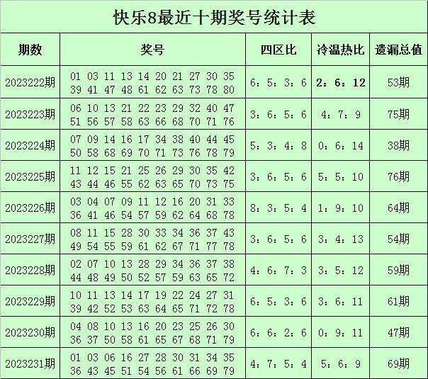 福彩快乐8第2023231期开奖回顾:01 03 06 16 27 28 30 31 34 35 36 43 45 51 54 56 61 66 69 79,其中奖号四区比为4:7:5:4,冷温热码比为5:6:9,遗漏总值为69。