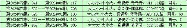 统计排列三已开出的奖号发现,在连续5期(第2024072期-第2024076)奖号为:341-590-629-285-968。