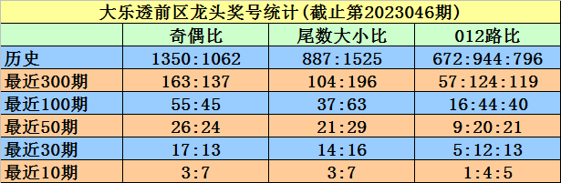 龙头号码奇偶比为3:7,尾数大小比为3:7,012路比为1:4:5。