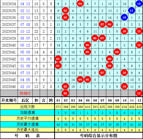 本期预计后区和值在14附近开出,后区参考号码:02、03、09、10、12。