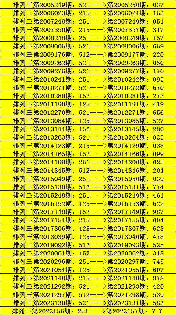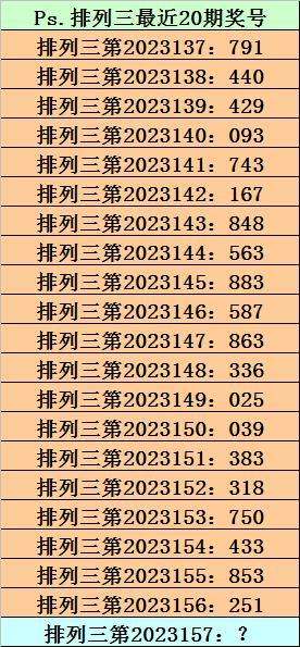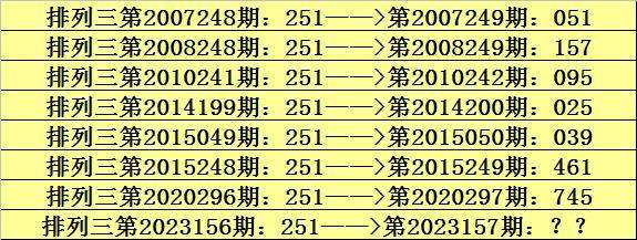 第2023156期排列三奖号为251,历史上该号码直选出现8次,下期奖号分别为:051、157、095、025、039、461、745。