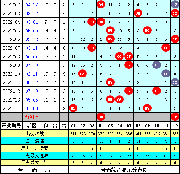 上期后区奖号为01和09,前10期后区奖号012路比为7:6:7,大小比为11:9,奇偶比为13:7,本期后区五码参考02、04、09、10、12,精选两码04、12。