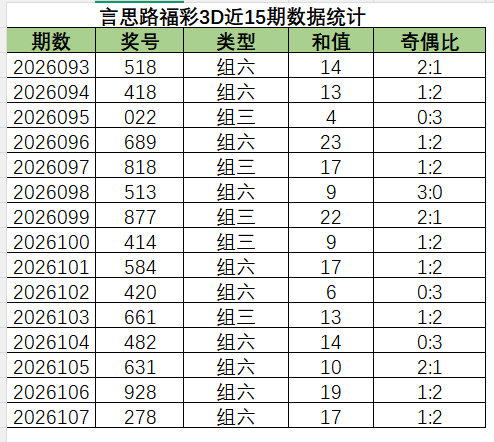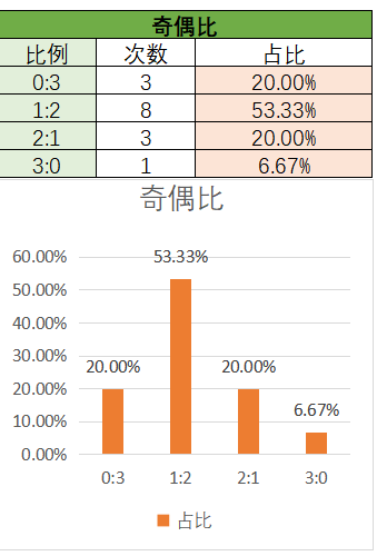 上期奇偶比为1:2,各个类型占比没有变化。近15期内1:2优势最好,然后是2:1,0:3,最后是0:3。上期开了1:2奇偶比,本期看好1:2和3:0奇偶比的开出,其次是2:1和0:3。