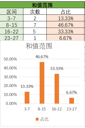 上期和值是17,其中16~22占比变大,8~15占比变小。目前是8~15占比最优,其次是16~22,然后是3~7,最后是23~27。本期看好和值在8~15之间,其次是16~22。