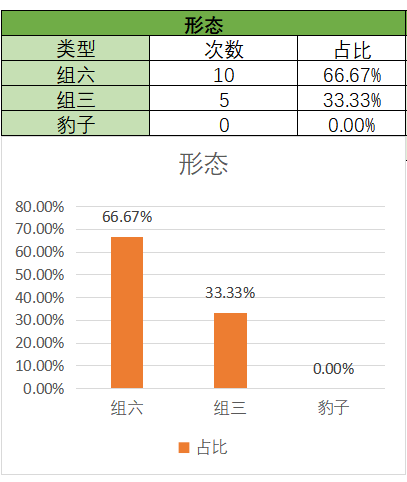 上期开的是组六,各个类型占比没有变化。通过图示可以看到,组六在15期内开了10期,组三开了5期。本期关注组六,防组三。
