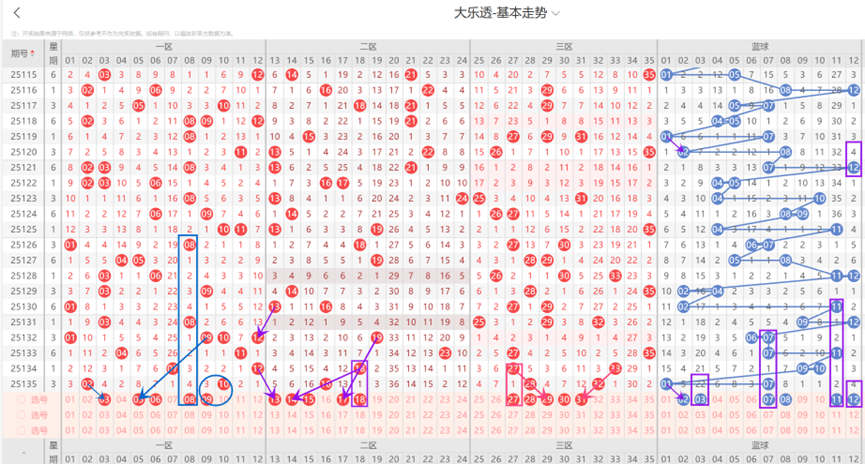 上一期后区开出01-07,后区奇偶比为2:0,大小比为1:1,质合比为2:0;本期后区需要关注的号码:02-08为邻号;03遗漏值高,值得防守;07可能会重出;11-12为当前出号热点号码;因此本期后区看好02-03-07-08-11等号码。