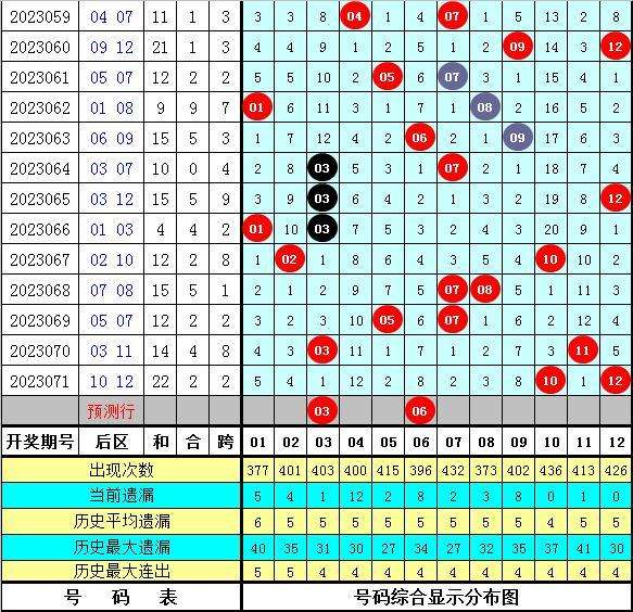 本期预计后区和值在9附近开出,后区参考号码:03、05、06、09、11。