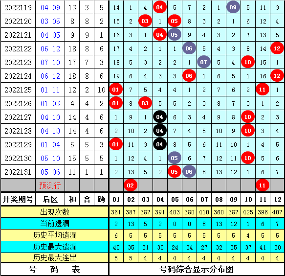 6、在历史同期第132期开奖中,后区一大一小组合出现9次,全大组合出现2次,全小组合出现3次,本期后区注意一大一小组合出现,关注号码02、03、08、11。